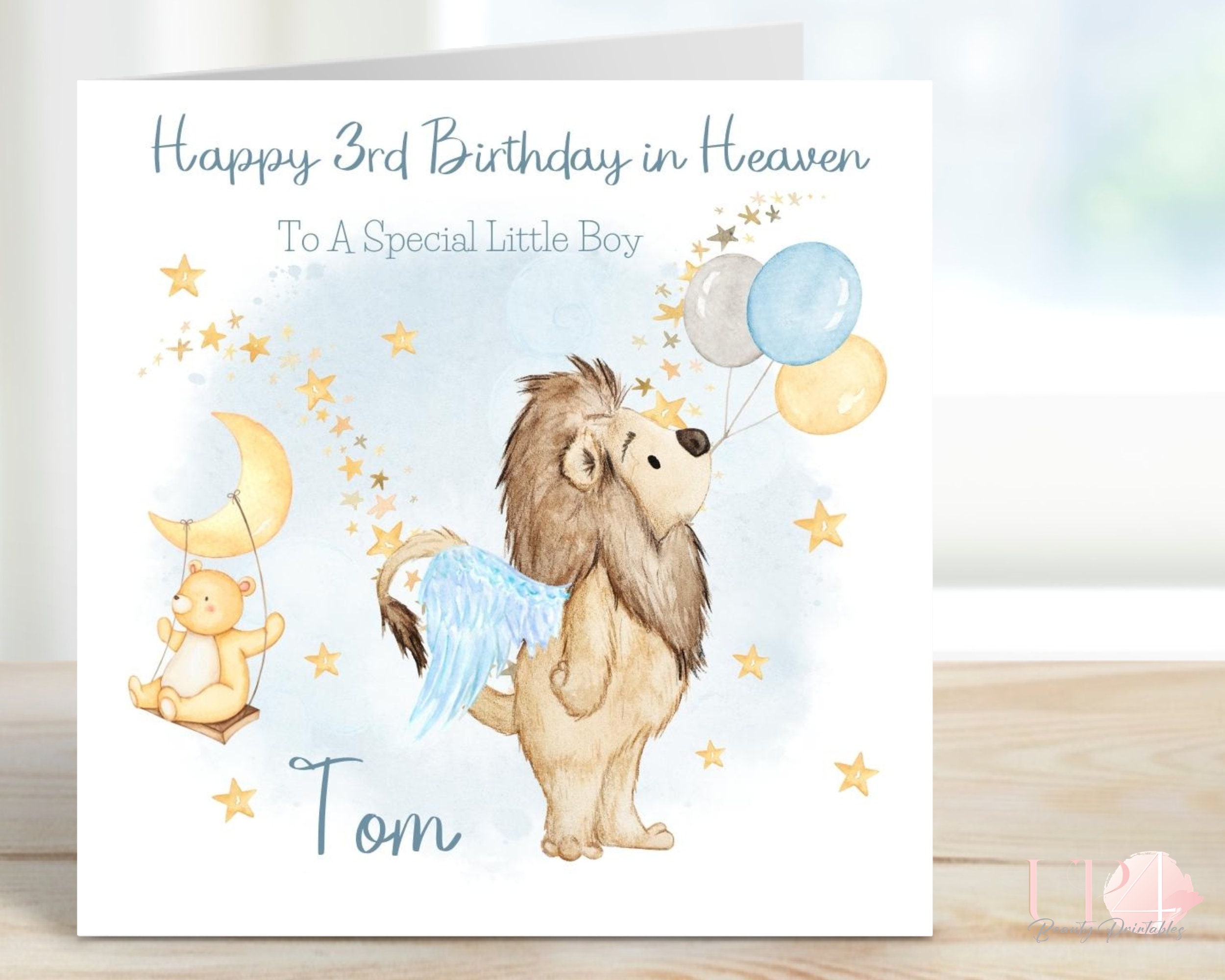 Personalised Heavenly Lion Birthday Card, Angel Baby Loss Card